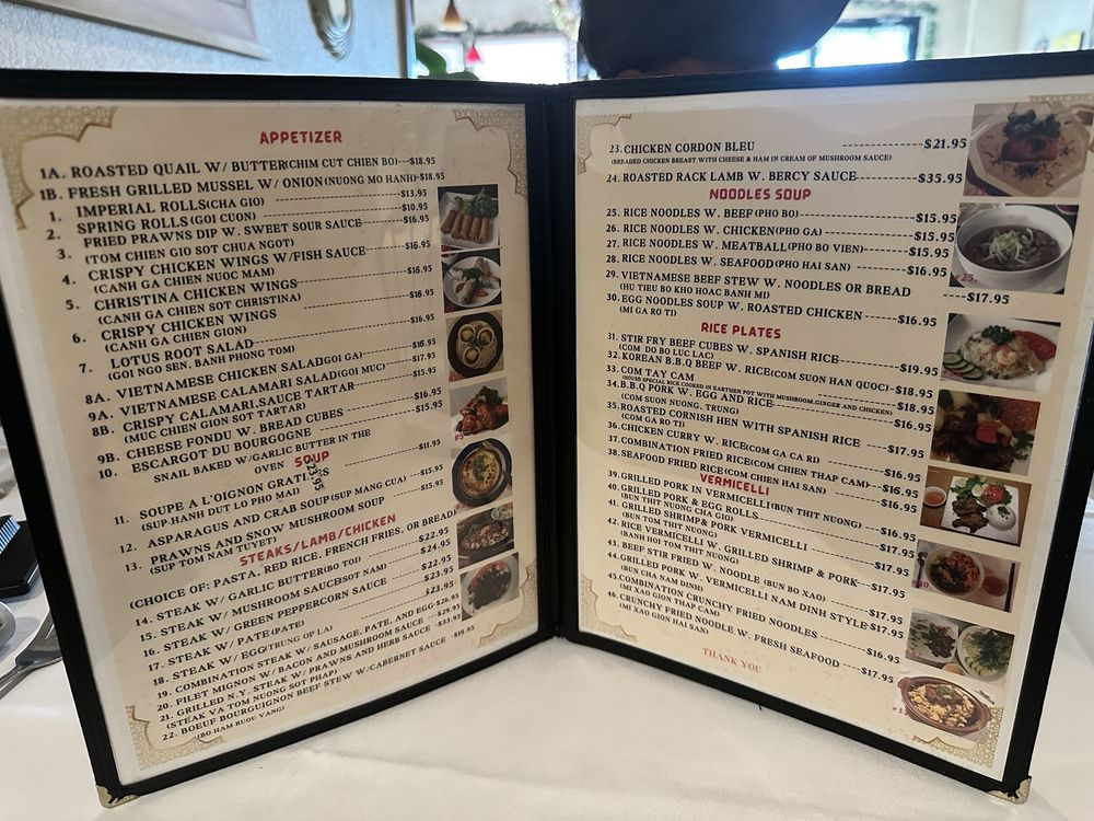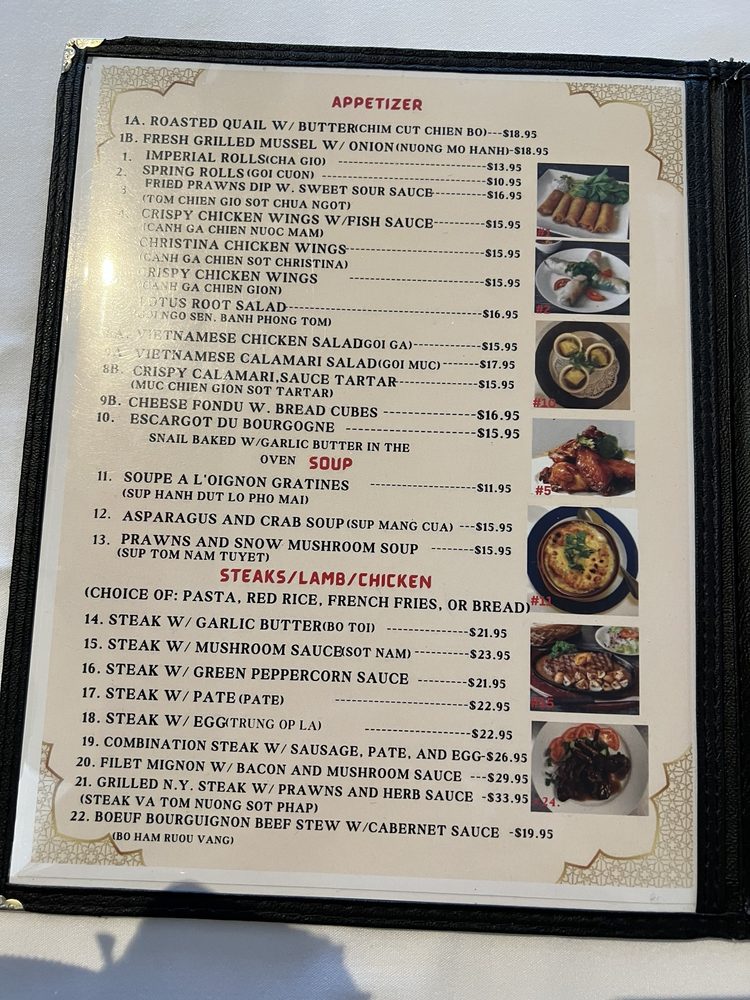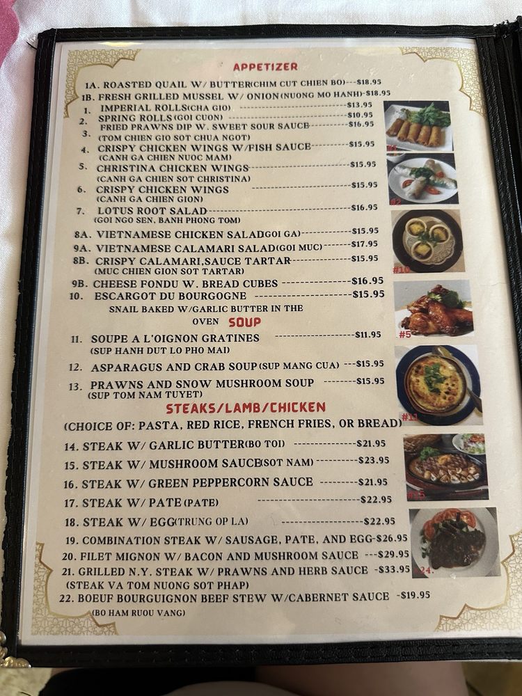 Chez Christina is a French-Vietnamese restaurant located in Milpitas, CA, offering a cozy ambiance, fresh food, and great service. With a diverse menu ranging from traditional Vietnamese dishes to French-inspired creations, this restaurant caters to a variety of tastes. Customer reviews highlight the flavorful dishes such as the com tay cam, steak with mushroom sauce, and crispy chicken wings with fish sauce. The Filet Mignon with Bacon and Mushroom Sauce is a standout dish that consistently exceeds expectations. The restaurant also accommodates dietary preferences, including keto-friendly options. Overall, Chez Christina is a hidden gem with 28+ years of history, making it a must-try for those looking for a unique and delicious dining experience.